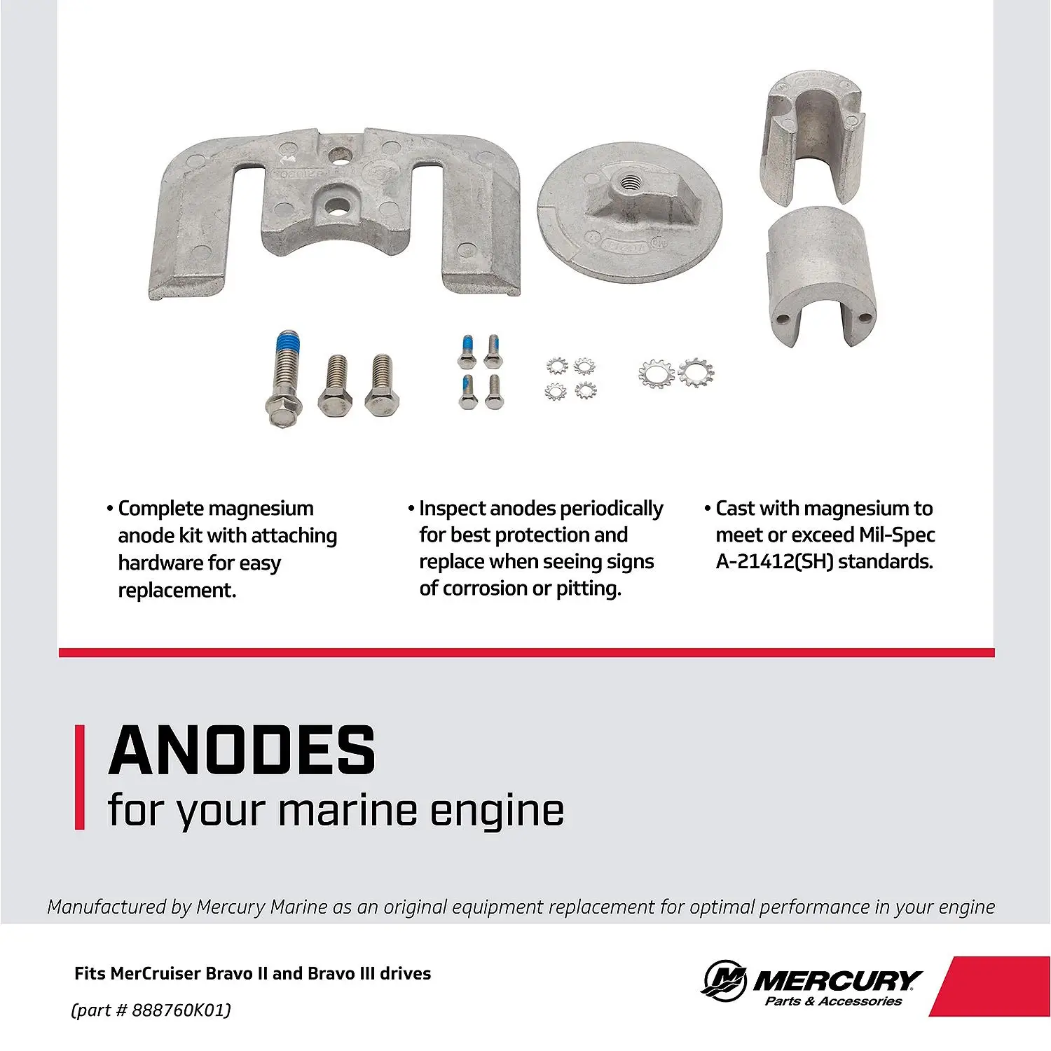 Mercury Magnesium Anode Kit 888760K01 delivers superior protection against galvanic corrosion in fresh water for select MerCruiser Bravo II and Bravo III drives. u2022 Fits 1988 and newer MerCruiser Bravo II drives (serial No. 0B664190 and up) and 1995-2002 Bravo III drives (0F345868 – 0M179451) u2022 Includes flat trim tab anode, drive shaft plate anode, lift ram anodes and attaching hardware for fast and easy replacement u2022 For freshwater use only u2022 For best results, inspect periodically and replace when signs of corrosion or pitting are visible u2022 Mercury parts and accessories are backed by decades of experience in engineering, testing and manufacturing to provide the best fit, function and performance u2022