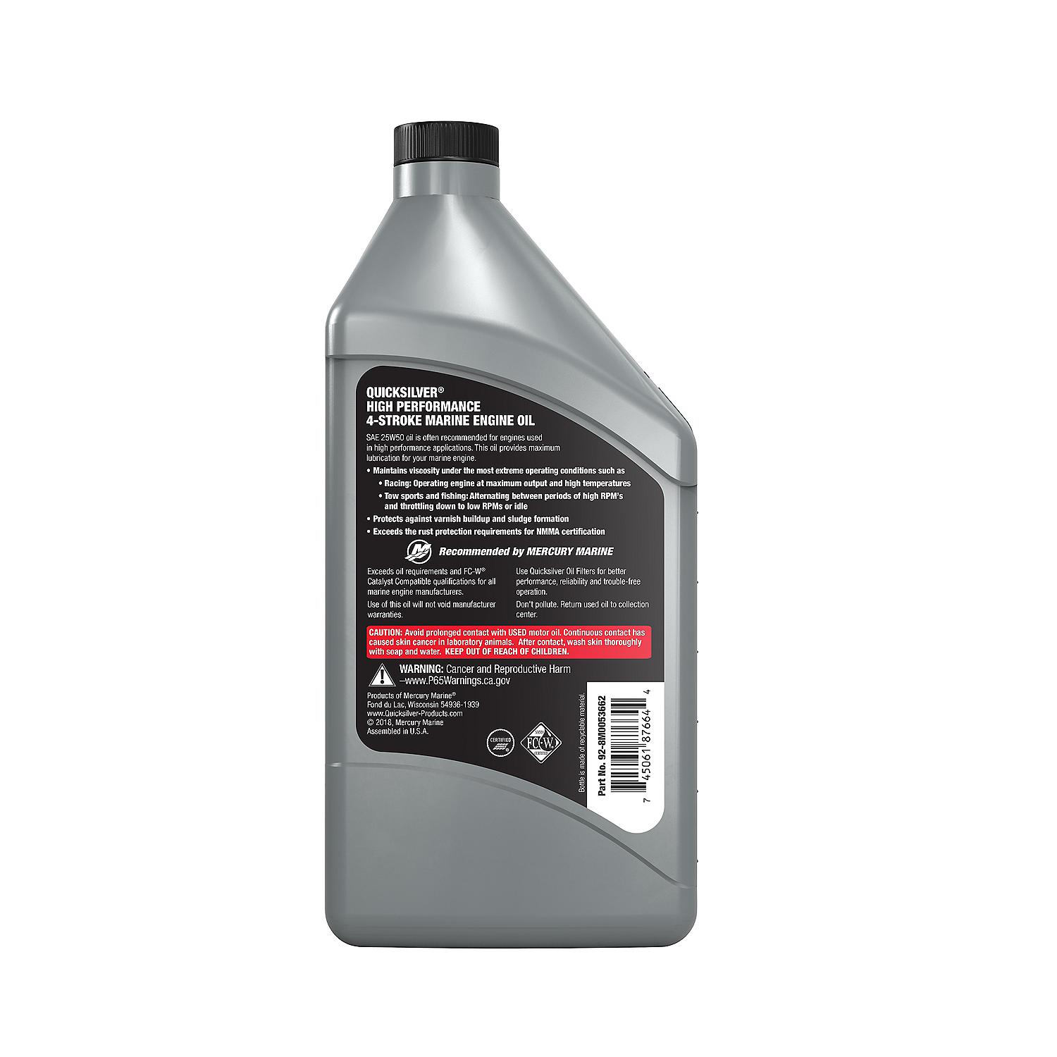 The Quicksilver brand is the leader in delivering uncompromising engine oils, parts and accessories to the marine industry for over 65 years. Quicksilver is the premier supplier of Mercury Marine original equipment replacement engine parts, oils, and accessories, but also works to serve all original equipment brands in the marine and powersports industries. It has earned a loyal following by providing the highest quality products that are tested through some of the most rigorous environments and testing procedures. No aftermarket company comes close to the level of research and design as Quicksilver; buying Quicksilver is buying performance, protection and peace of mind. u2022 Quicksilver brand synthetic blend SAE 25W-50 u2022 Recommended for Mercury Verado and other high performance marine engines u2022 Provides outstanding wear and corrosion protection to help extend engine life u2022 Maintains its viscosity, protects against varnish buildup and sludge formation and exceeds the rust protection requirements for NMMA certification u2022 Meets or exceeds all marine engine manufacturer’s warranty requirements and recommendations for use of an FC-W marine engine oil u2022 Produced to meet Mercury Marine original equipment manufacturer specifications to maximize the performance of your Mercury and Mariner outboard or MerCruiser sterndrive