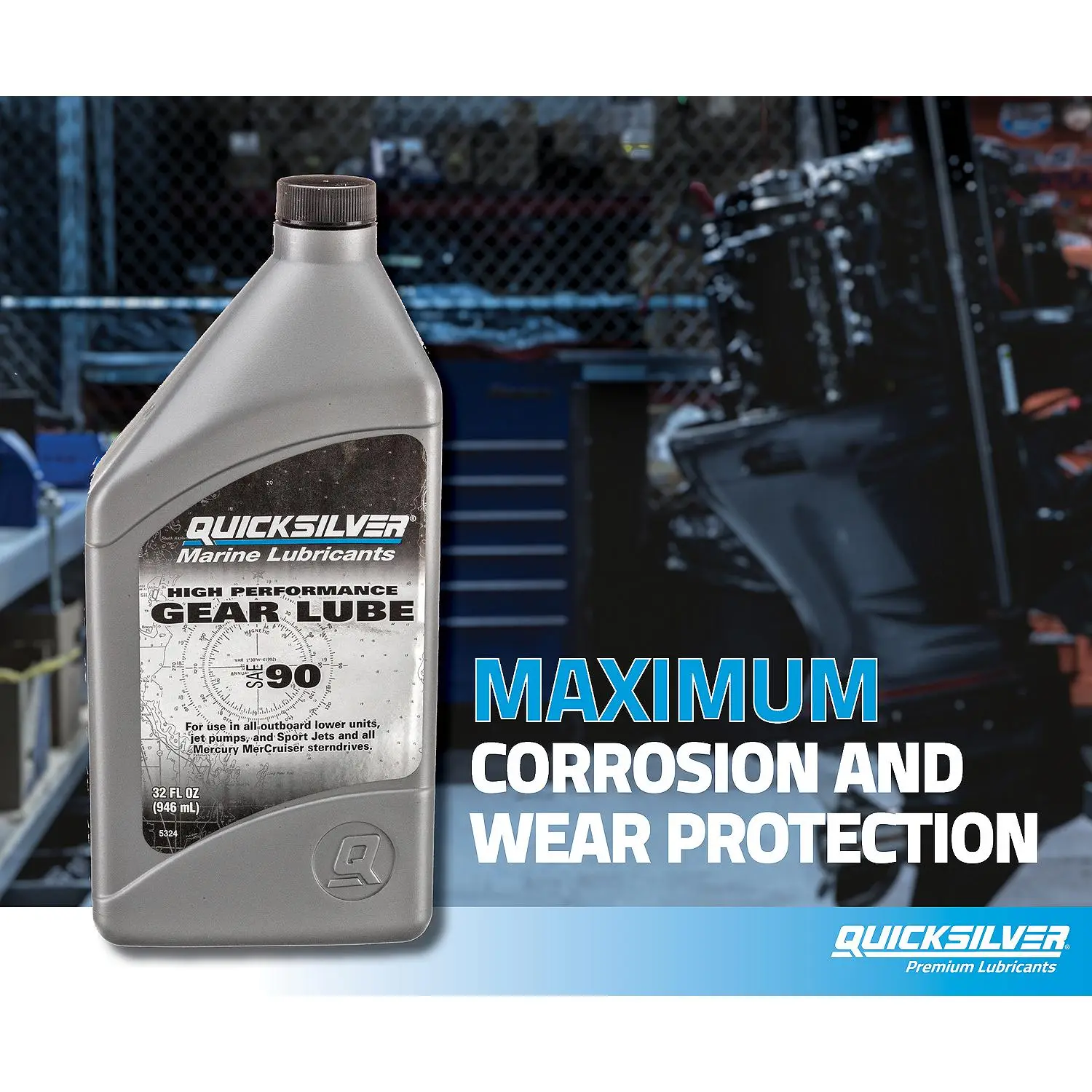The Quicksilver brand is the leader in delivering uncompromising engine oils, parts and accessories to the marine industry for over 65 years. Quicksilver is the premier supplier of Mercury Marine original equipment replacement engine parts, oils, and accessories, but also works to serve all original equipment brands in the marine and powersports industries. It has earned a loyal following by providing the highest quality products that are tested through some of the most rigorous environments and testing procedures. No aftermarket company comes close to the level of research and design as Quicksilver; buying Quicksilver is buying performance, protection and peace of mind. u2022 Lower unit gear oil formulated to protect against corrosion and excessive wear u2022 Designed for outboard motor lower unit and sterndrive applications above 75hp u2022 Extreme pressure synthetic additives protect gears from metal to metal contact u2022 SAE 90 viscosity u2022 Manufacturer part number 802851Q02 u2022