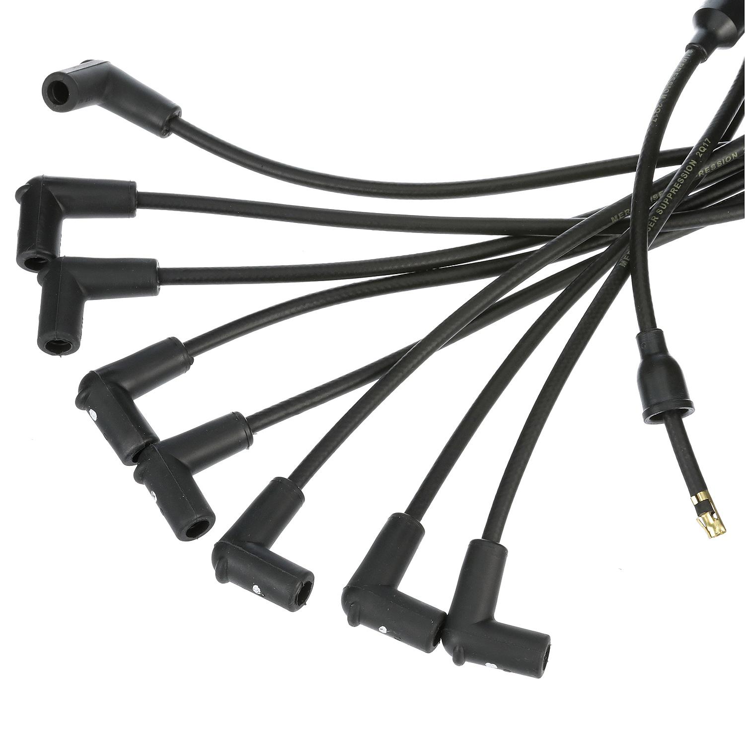 The Quicksilver brand is the leader in delivering uncompromising engine oils, parts and accessories to the marine industry for over 65 years. Quicksilver is the premier supplier of Mercury Marine original equipment replacement engine parts, oils, and accessories, but also works to serve all original equipment brands in the marine and powersports industries. It has earned a loyal following by providing the highest quality products that are tested through some of the most rigorous environments and testing procedures. No aftermarket company comes close to the level of research and design as Quicksilver; buying Quicksilver is buying performance, protection and peace of mind. u2022 Complete set of 8 spark plug wires with boots at spark plug end u2022 Tailored to reach the correct plug location u2022 Designed for efficiency, endurance and durability in a marine engine environment u2022 u2022 u2022