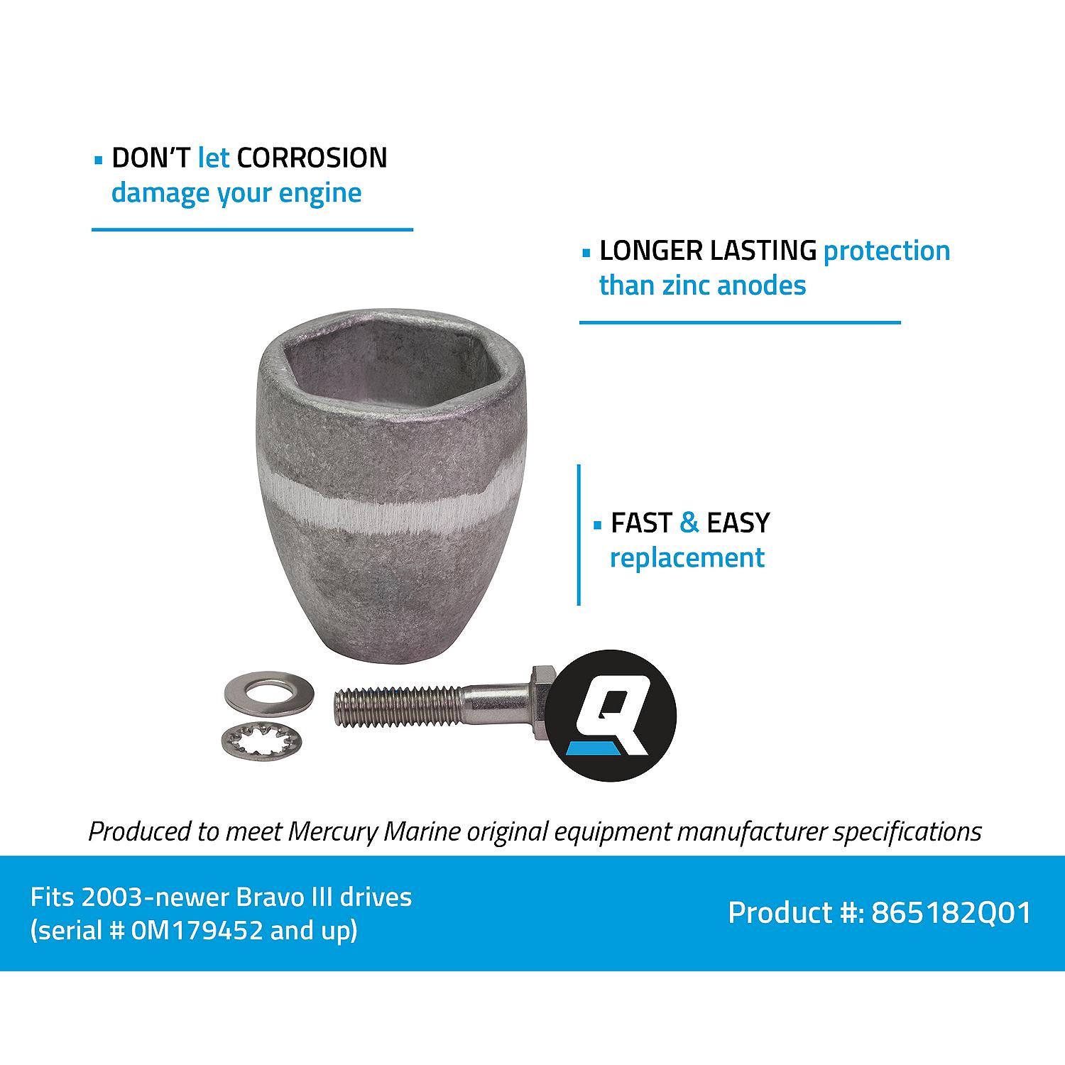 The Quicksilver brand is the leader in delivering uncompromising engine oils, parts and accessories to the marine industry for over 65 years. Quicksilver is the premier supplier of Mercury Marine original equipment replacement engine parts, oils, and accessories, but also works to serve all original equipment brands in the marine and powersports industries. It has earned a loyal following by providing the highest quality products that are tested through some of the most rigorous environments and testing procedures. No aftermarket company comes close to the level of research and design as Quicksilver; buying Quicksilver is buying performance, protection and peace of mind. u2022 This aluminum anode kit includes installation hardware for fast and easy replacement of corroded anodes u2022 Inspect anodes periodically for best protection and replace when seeing signs of corrosion or pitting u2022 These anodes meet or exceed mil-spec MIL-A-24779(SH) providing longer lasting protection than zinc anodes and are for use in fresh or saltwater u2022 Produced to meet Mercury Marine original equipment manufacturer specifications to best protect your MerCruiser sterndrive u2022 u2022