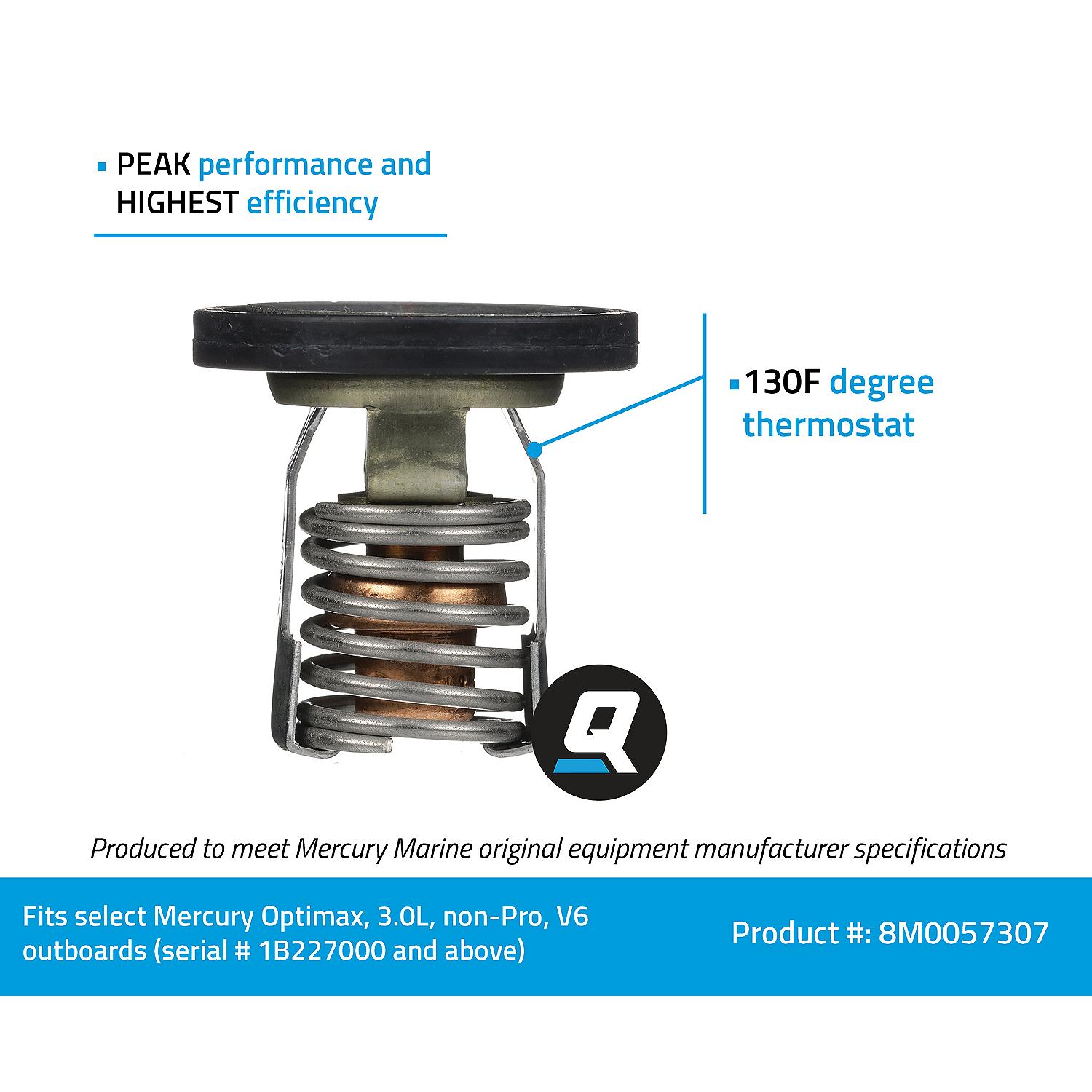 The Quicksilver brand is the leader in delivering uncompromising engine oils, parts and accessories to the marine industry for over 65 years. Quicksilver is the premier supplier of Mercury Marine original equipment replacement engine parts, oils, and accessories, but also works to serve all original equipment brands in the marine and powersports industries. It has earned a loyal following by providing the highest quality products that are tested through some of the most rigorous environments and testing procedures. No aftermarket company comes close to the level of research and design as Quicksilver; buying Quicksilver is buying performance, protection and peace of mind. u2022 130°F thermostat u2022 Use only the temperature thermostat listed in your owner’s manual or service manual u2022 Proper engine cooling temperature ensures peak performance and highest efficiency u2022 Calibrated for proper cooling system temperature response u2022 Self-cleaning design allows cooling system contaminants to flush through closing surfaces u2022 Easy to replace with common shop tools