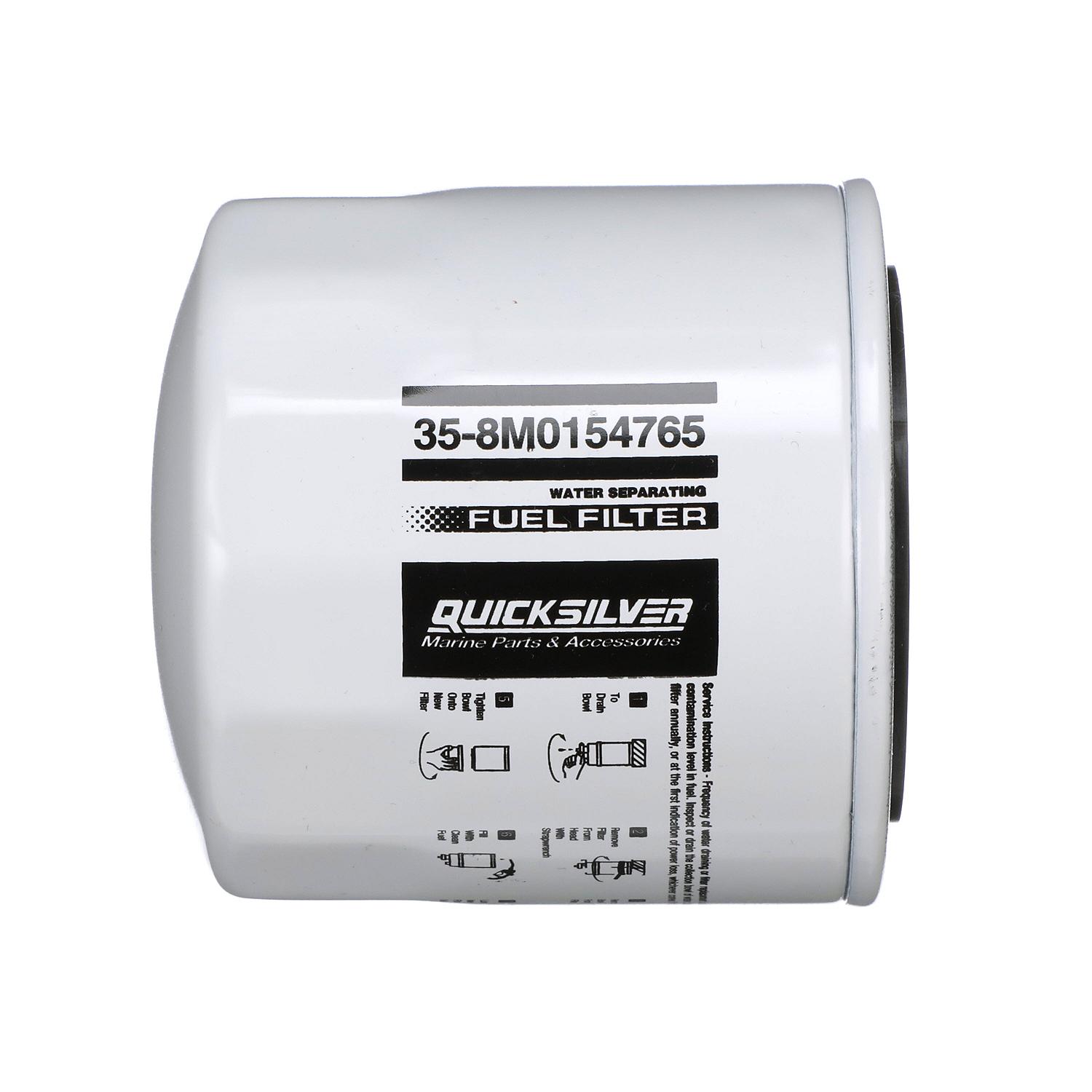 The Quicksilver brand is the leader in delivering uncompromising engine oils, parts and accessories to the marine industry for over 65 years. Quicksilver is the premier supplier of Mercury Marine original equipment replacement engine parts, oils, and accessories, but also works to serve original equipment brands in the broadening marine, powersports and power equipment industries. It has earned a loyal following by providing the highest quality products that are tested through some of the most rigorous environments and testing procedures. No aftermarket company comes close to the level of research and design as Quicksilver; buying Quicksilver is buying performance, protection and peace of mind. u2022 20 micron filtration delivering over 90% efficiency to provide your engine with clean fuel for peak performance u2022 Water separating fuel filters help keep damaging debris from getting to your engine while also keeping performance-robbing water from reducing the efficiency and economy of the engine u2022 Replace the filter once each season or as your owner’s manual recommends based on engine use u2022 Replaces GLM 24941, Mallory 9-37800, Fram PS3808, Moeller 33323-10, WIX 33225, Sierra 18-7844 u2022 Universal Head fit, 93mm height u2022 Easy to remove old filter and install the clean, new filter